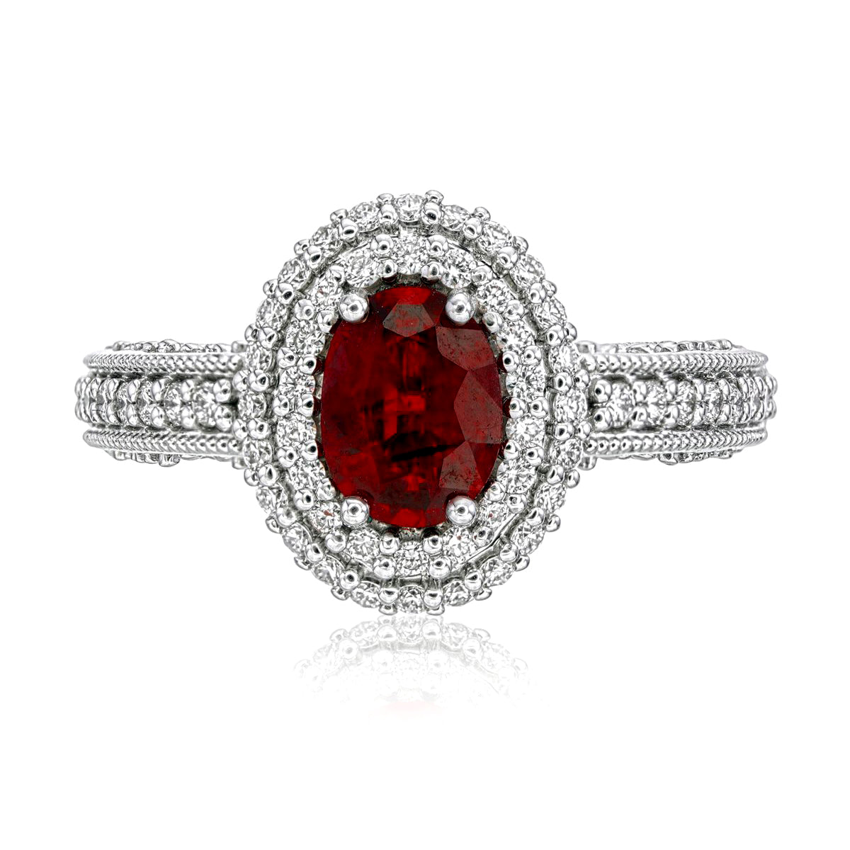 - หินตรงกลางเป็นทับทิมแดง 'Pigeon Blood' ทรงเบาะน้ำหนัก 0.72 กะรัต ได้รับการรับรองจาก GRS