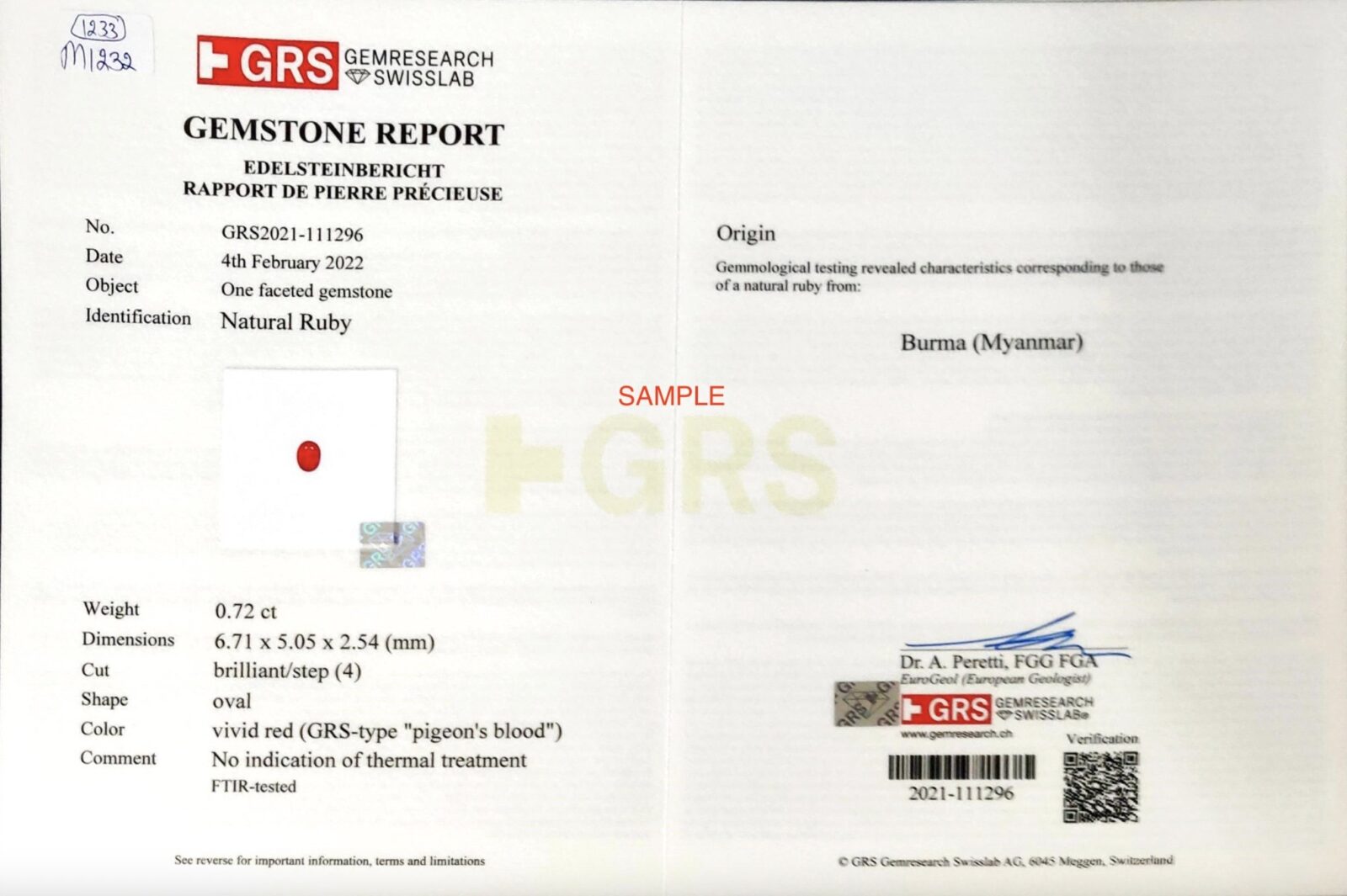 - ใบรับรอง GRS ระบุว่าหินเป็นของพม่าและเป็นธรรมชาติโดยไม่ต้องผ่านการปรับปรุงใดๆ