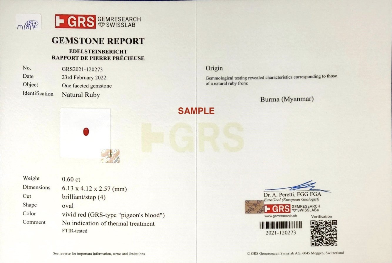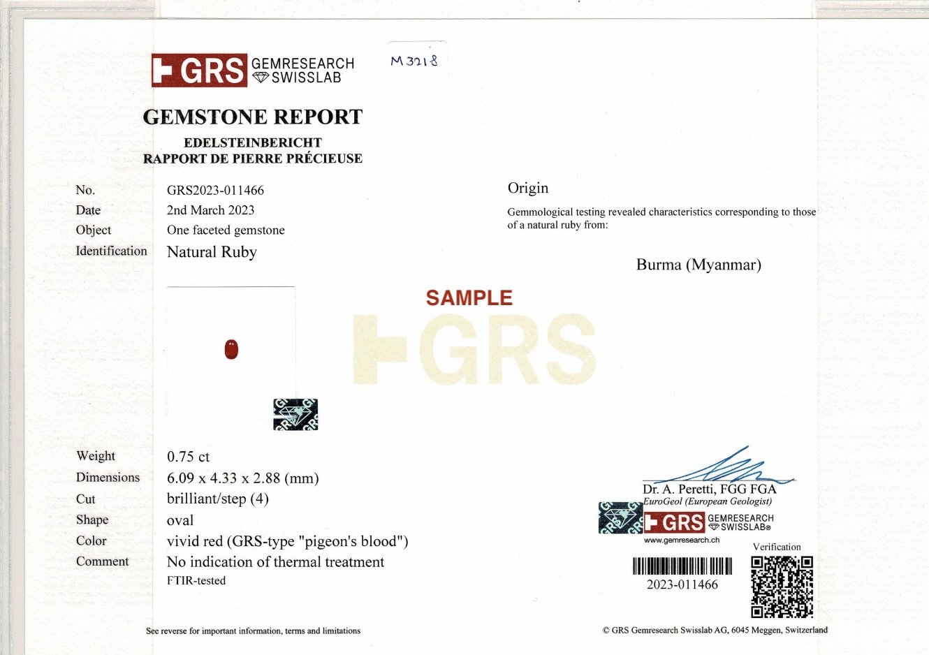 - ทับทิมทุกเม็ดได้รับการทดสอบและรับรองจาก GRS (Gem Research Swisslab) ว่าเป็นทับทิมธรรมชาติจากพม่าโดยไม่ได้ผ่านกระบวนการให้ความร้อนใดๆ