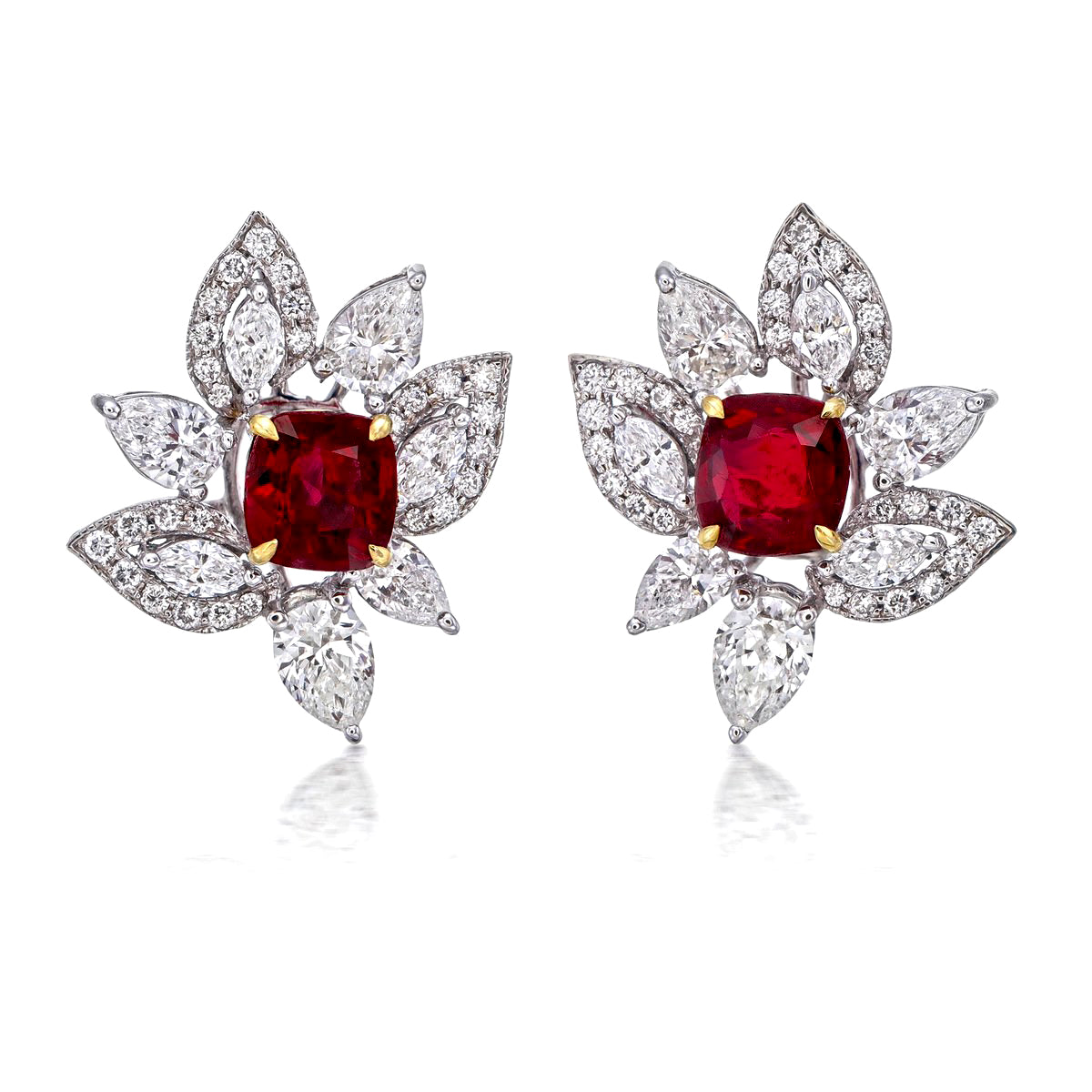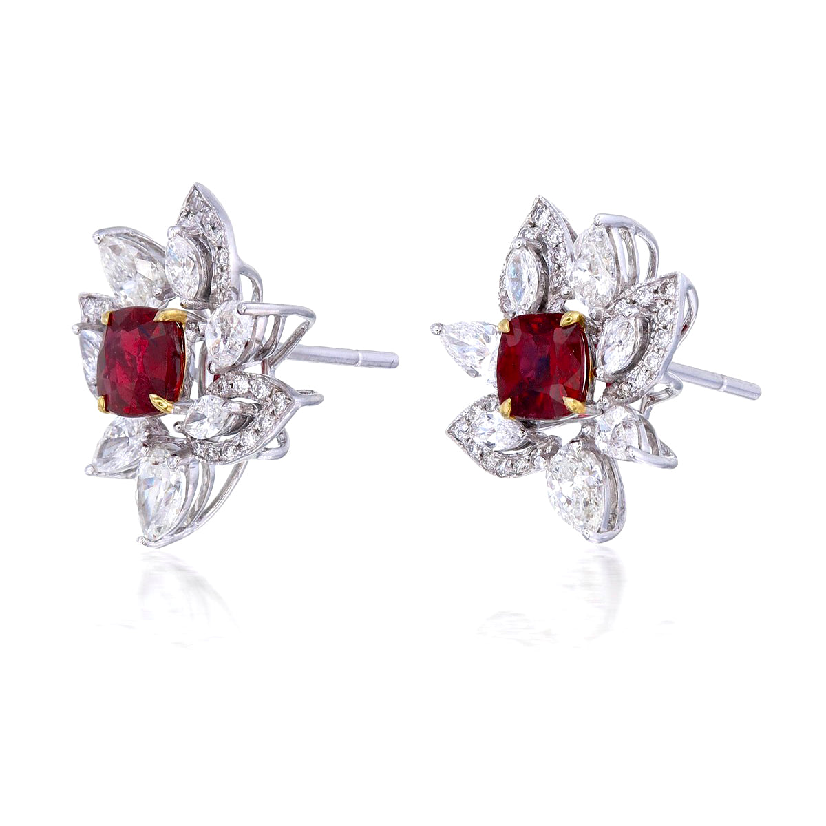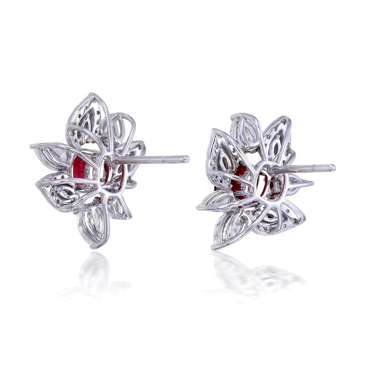 ต่างหูทับทิมและเพชรรูปดอกไม้สุดคลาสสิกคู่หนึ่ง ผลิตจากทอง 18K ต่างหูคู่นี้เน้นความเรียบง่ายแต่ยังคงความสง่างาม เหมาะสำหรับสวมใส่ในชีวิตประจำวัน