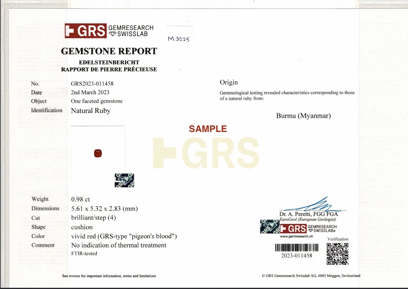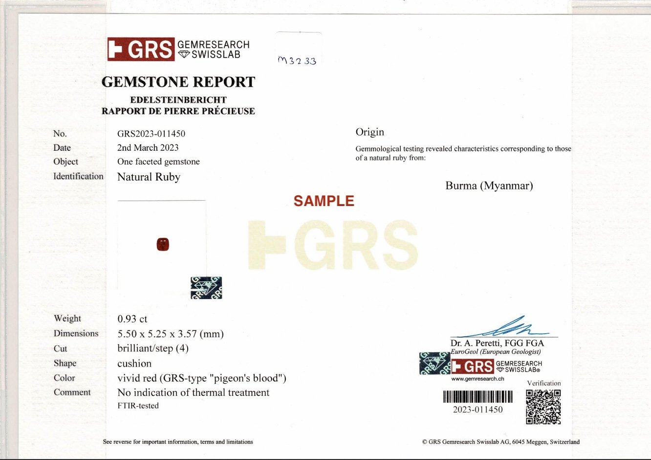 - ทับทิมทุกเม็ดได้รับการทดสอบและรับรองจาก GRS (Gem Research Swisslab) ว่าเป็นทับทิมธรรมชาติจากพม่า โดยไม่ได้ผ่านการอบด้วยความร้อนใดๆ