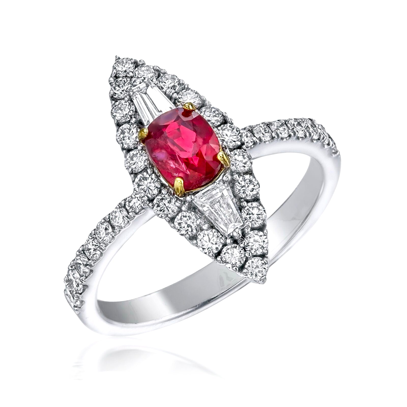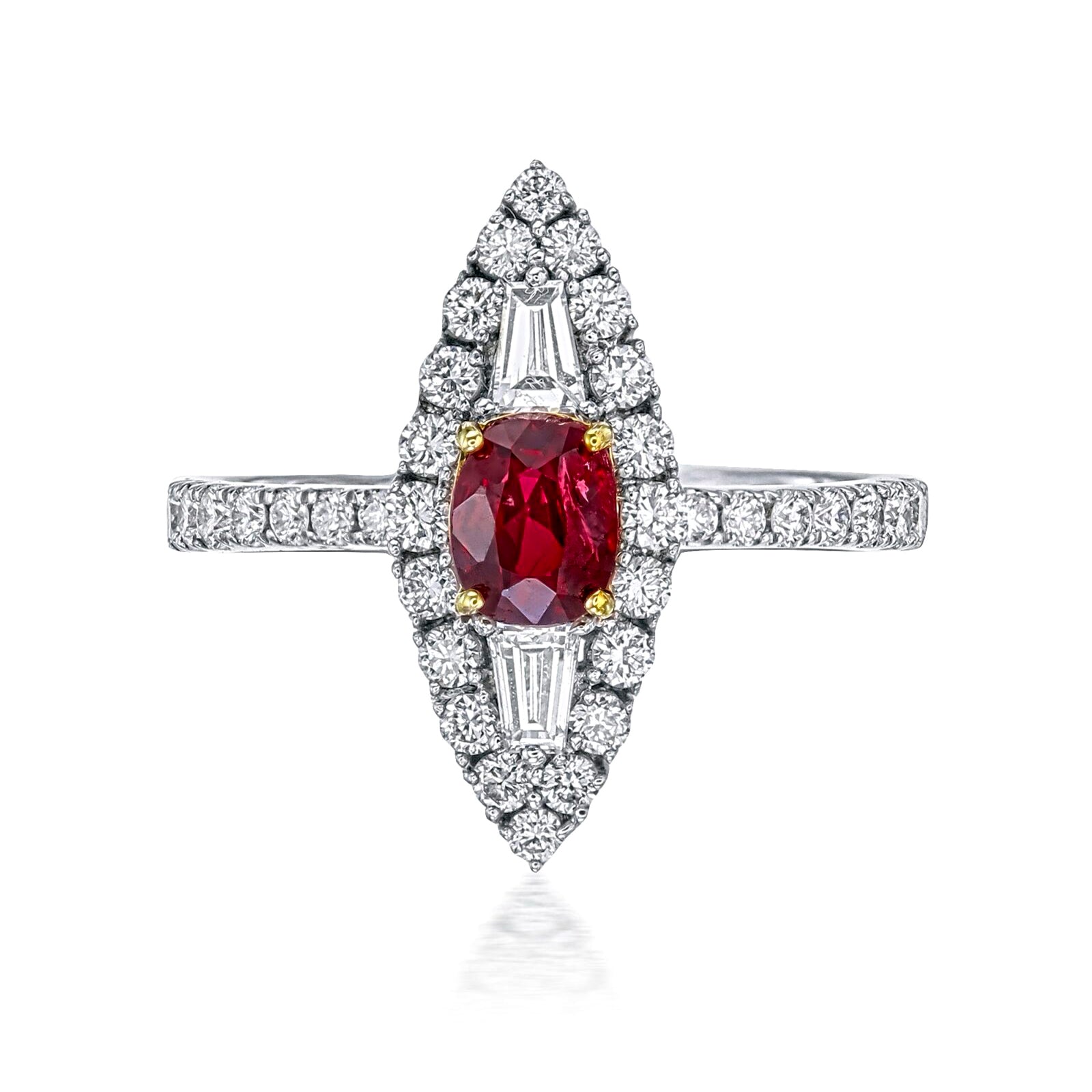 ทับทิมเม็ดเลือดนกพิราบแท้รับรอง GRS หนัก 0.7 กะรัต เพชรทรงเรียว 2 เม็ด หนักรวม 0.18 กะรัต มีเพชรกลม 34 เม็ดในแหวน รวมน้ำหนัก 0.59 กะรัต แหวนหนักรวม 4.17 กรัม