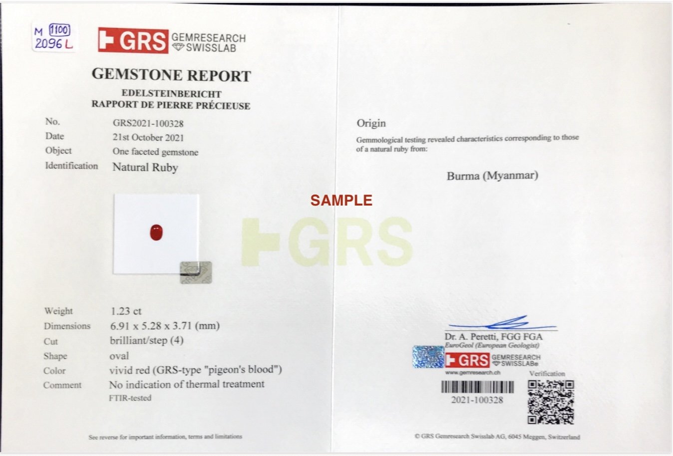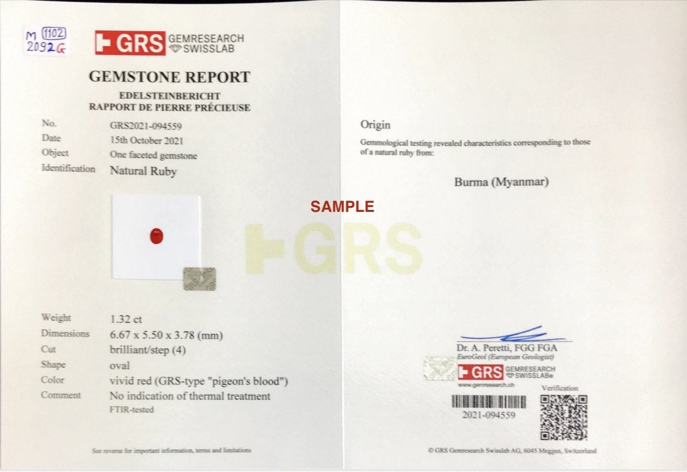 - ทับทิมทุกเม็ดได้รับการทดสอบและรับรองจาก GRS (Gem Research Swisslab) ว่าเป็นทับทิมธรรมชาติจากพม่าโดยไม่ได้ผ่านกระบวนการให้ความร้อนใดๆ